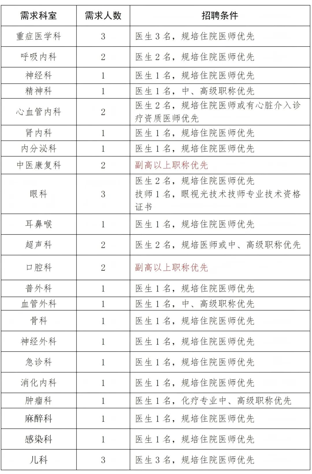 二、岗位需求除下列所需岗位外,其他临床专业请电话微信咨询。