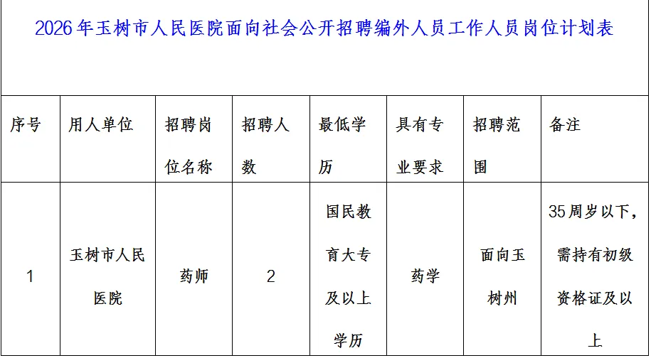 为加强我院医疗人才队伍建设为核心,拓宽选人用人渠道来优化人才结构,同时兼顾解决社会就业问题,进一步补充我院医疗、药学专业技术力量,优化人员队伍结构,推进医院高质量发展,最终更好地满足玉树当地群众的医疗卫生服务需求为目的,依据《事业单位人事管理条例》《医疗机构人员招聘相关规定》,结合我院诊疗工作实际及发展需要,现面向社会公开招聘编制外专业技术人员2人,现将有关事项公告如下: