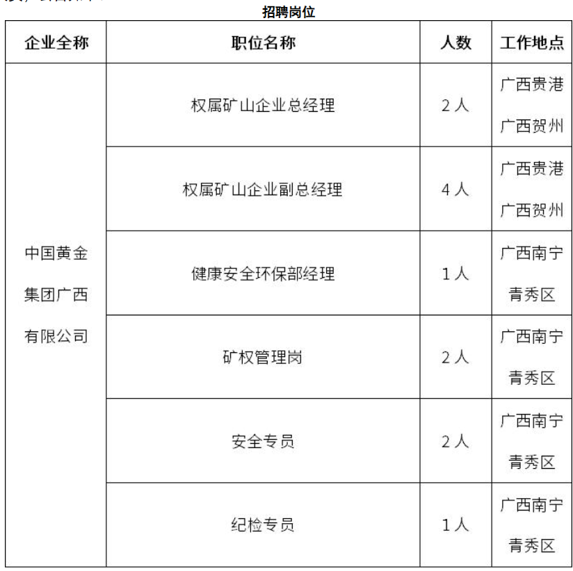 根据发展规划与高质量发展需要,中国黄金集团广西有限公司发布招聘公告,面向社会招聘一批业务骨干人员,公告如下。