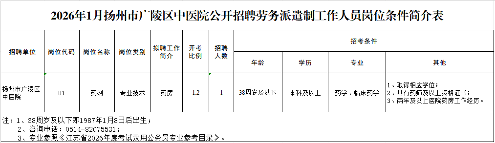 4、符合《2026年1月扬州市广陵区中医院公开招聘劳务派遣制工作人员岗位条件简介表》(以下简称《岗位简介表》,附后)中各岗位所规定的具体资格条件;