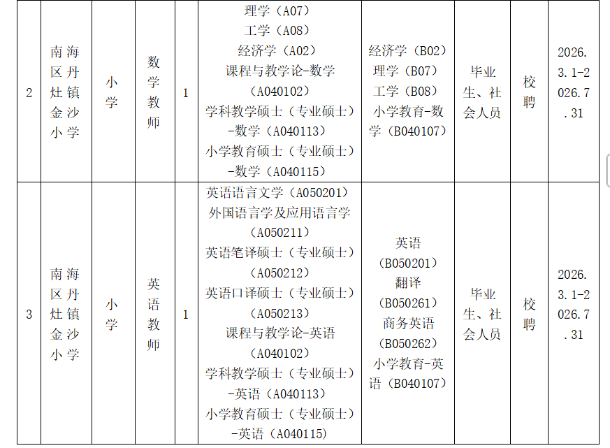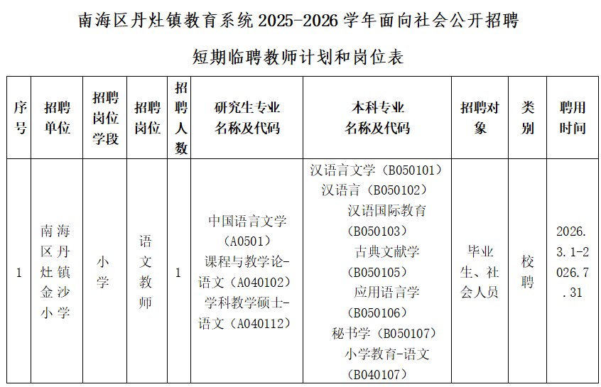 2025—2026学年我镇金沙小学计划公开招聘语文、数学、英语临聘教师各1名。招聘对象分为应届毕业生和社会人员两类,招聘计划及对象要求详见《丹灶镇2025-2026学年临聘教师招聘计划和岗位表》。