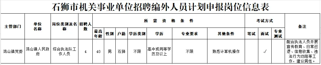 招聘岗位及要求详见《石狮市鸿山镇人民政府2026年公开招聘编外工作人员岗位信息表》(附件1)。