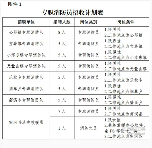 1.南涧县消防救援局:7名专职消防员(限男性)、1名消防文员(限女性);