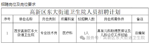 西安高新区东大街道卫生院是国家公益一类卫生事业医疗机构,服务东大辖区常住及流动居民,提供以解决社区主要卫生问题、满足基本卫生服务需求为目的,融预防、医疗、保健、康复、健康教育等为一体的,有效、经济、方便、综合、连续的基层卫生服务。因业务发展需要,现招聘1名工作人员,具体招聘岗位及要求如下: