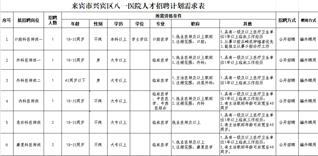 2.报名时间:发布招聘公告之日起至招满为止。3.报名地点:来宾市兴宾区八一医院住院综合楼五楼人事科。(地址:来宾市兴宾区八一街道康乐路1号)。4.资格审查:报名者应提交本人有效居民身份证、毕业证、执业证、资格证、职称证、《来宾市兴宾区八一医院公开招聘编外人员报名表》等材料原件及复印件。经招聘工作领导小组办公室审核通过。报名提供材料和填写的信息必须真实准确,凡不具备招聘资格或弄虚作假者,取消报名资格。(二)组织面试资格审查合格者,参加医院招聘工作领导小组办公室组织的面试,面试着重考察应聘者的业务素质及潜在能力,包括综合分析、言语表达、计划组织、人际关系、应变能力以及自我认知程度等,综合评估应聘者与报考岗位的匹配度,面试工作结束后从面试成绩高分到低分顺序确定进入一下环节人员名单。(三)体检由招聘工作领导小组办公室统一安排,不按时参加体检者,视同放弃资格。体检标准参照国家公务员入职体检标准执行,费用由应聘者自行承担。(四)确定拟聘人员通过面试、考核及体检结果确定拟聘人员,拟聘人员名单在医院工作范围公示5个工作日。(五)办理聘用手续经公示无异议,或有异议经核实不影响聘用的,由医院与应聘者签订聘用合同,明确双方的权利、义务和责任。