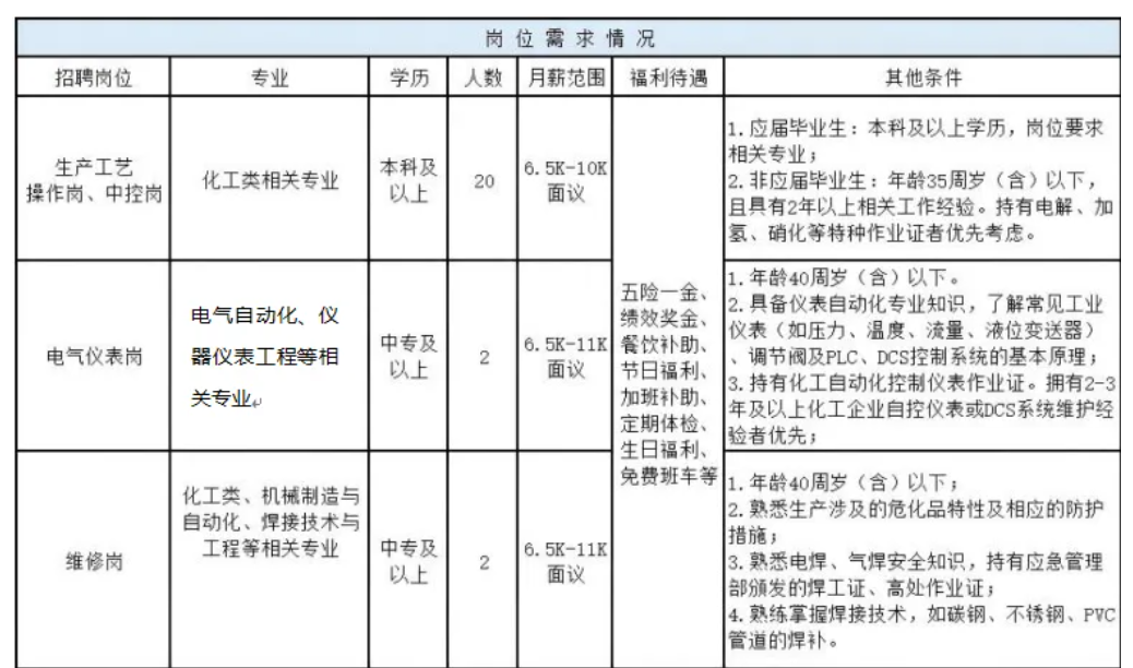 公司是一家以热电、氯碱、苯胺、甲烷氯化物项目为一体的综合性盐化工企业。根据公司发展需要,现面向社会公开招聘,具体如下:
