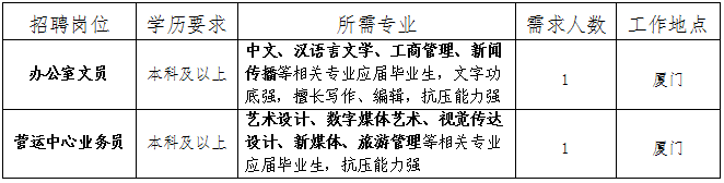 上述资料打包为一个压缩文件,以“应聘岗位+姓名+学校+专业”命名,并在规定时间内通过电子邮件发至公开招聘指定邮箱:891191@qq.com,或线下投递至厦轮客旅人力资源部(福建省厦门市湖里区海山路16号海运大厦11楼)。
