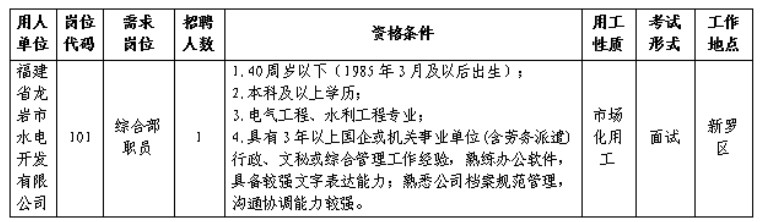福建省龙岩市水电开发有限公司关于公开招聘市场化用工工作人员的公告