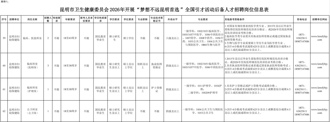 具体招聘岗位及招聘条件见《昆明市妇幼保健院2026年“梦想不远昆明首选”全国引才活动后备人才招聘岗位信息表》(附件2)(以下统一简称《岗位信息表》)。