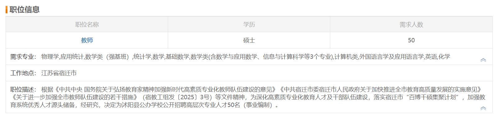 根据《中共中央国务院关于弘扬教育家精神加强新时代高素质专业化教师队伍建设的意见》《中共宿迁市委宿迁市人民政府关于加快推进全市教育高质量发展的实施意见》《关于进一步加强全市教师队伍建设的若干措施》(宿教工组发〔2025〕3号)等文件精神,为深化高素质专业化教育人才及干部队伍建设,落实宿迁市“百博千硕集聚计划”,加强教育系统优秀人才源头储备,经研究,决定为沭阳县公办学校公开招聘高层次专业人才50名(事业编制)。现将有关事项公布如下: