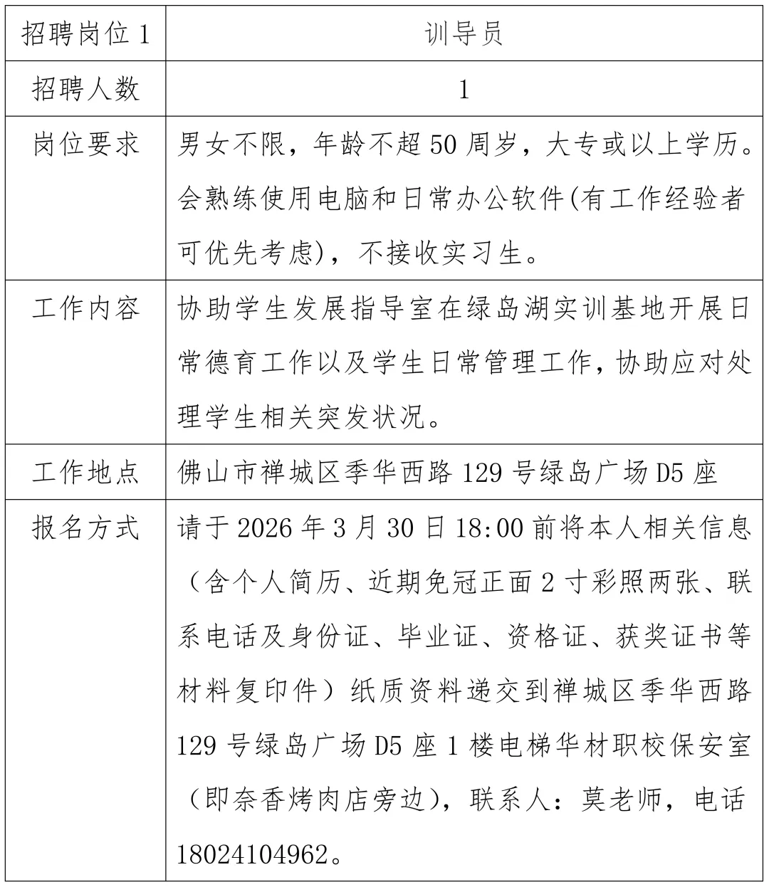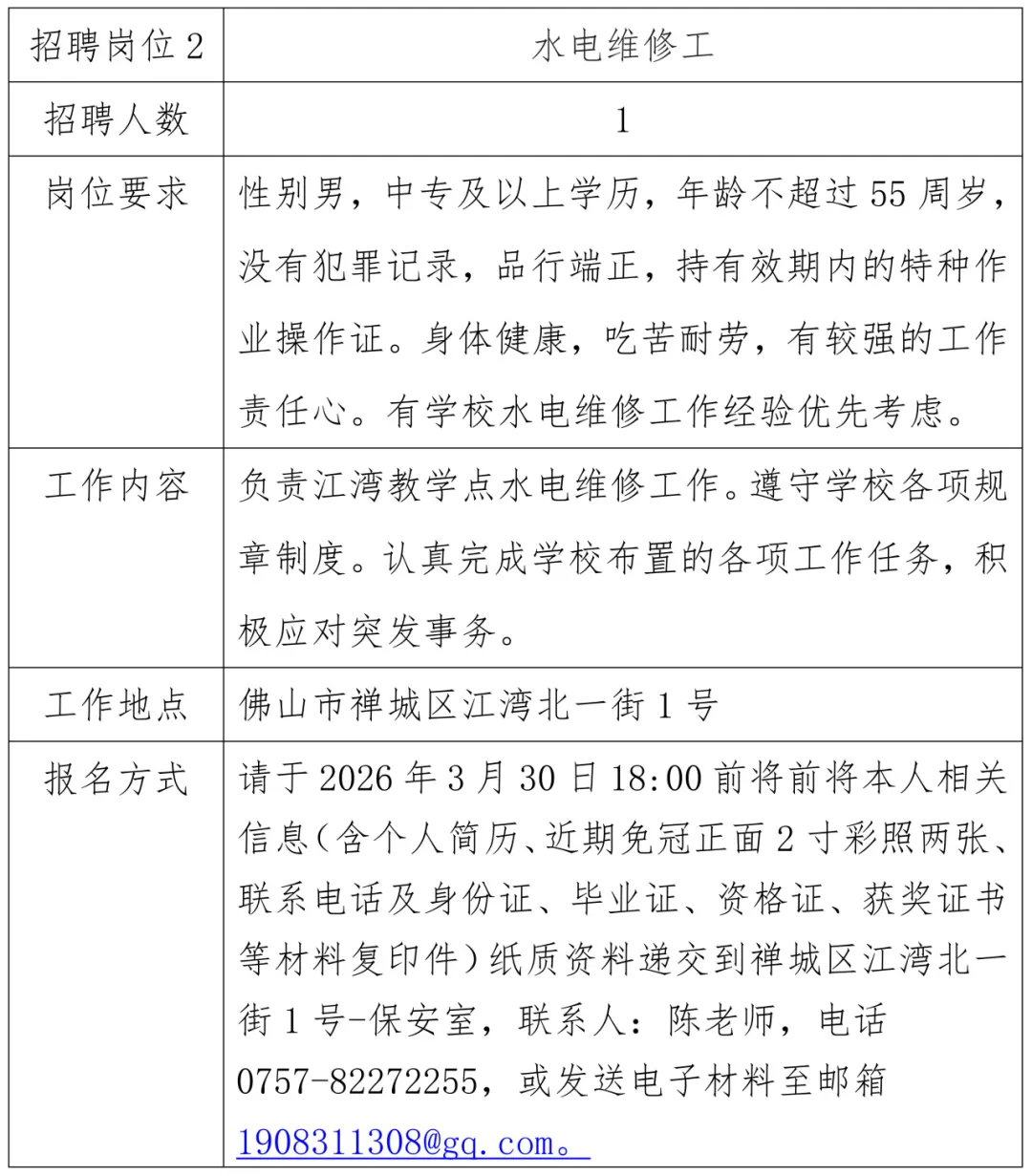因学校发展需要,佛山市华材职业技术学校现向社会招聘合同人员2名。
