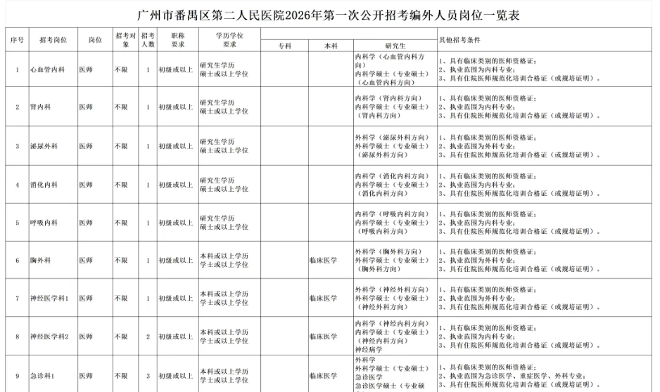 1.报考人员须具备报考岗位《广州市番禺区第二人民医院2026年第一次公开招考编外人员岗位一览表》中要求的专业、学历、学位、专业技术资格(执业资格)及其他资格条件。