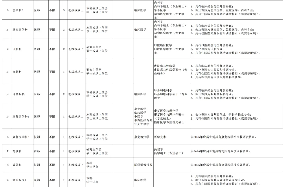 2.医学类专业技术人员,西医在2015年12月1日前毕业的、中医在2018年6月22日前毕业的,免规范化培训合格证;已完成规范化培训,未取得规范化合格证的,须提供培训单位的规范化培训证明或成绩单;报考有执业范围要求的招聘岗位,应聘人员因正在参加住院医师规范化培训,未注册执业范围的,可选择与住院医师规范化培训专业对应的执业范围报考。