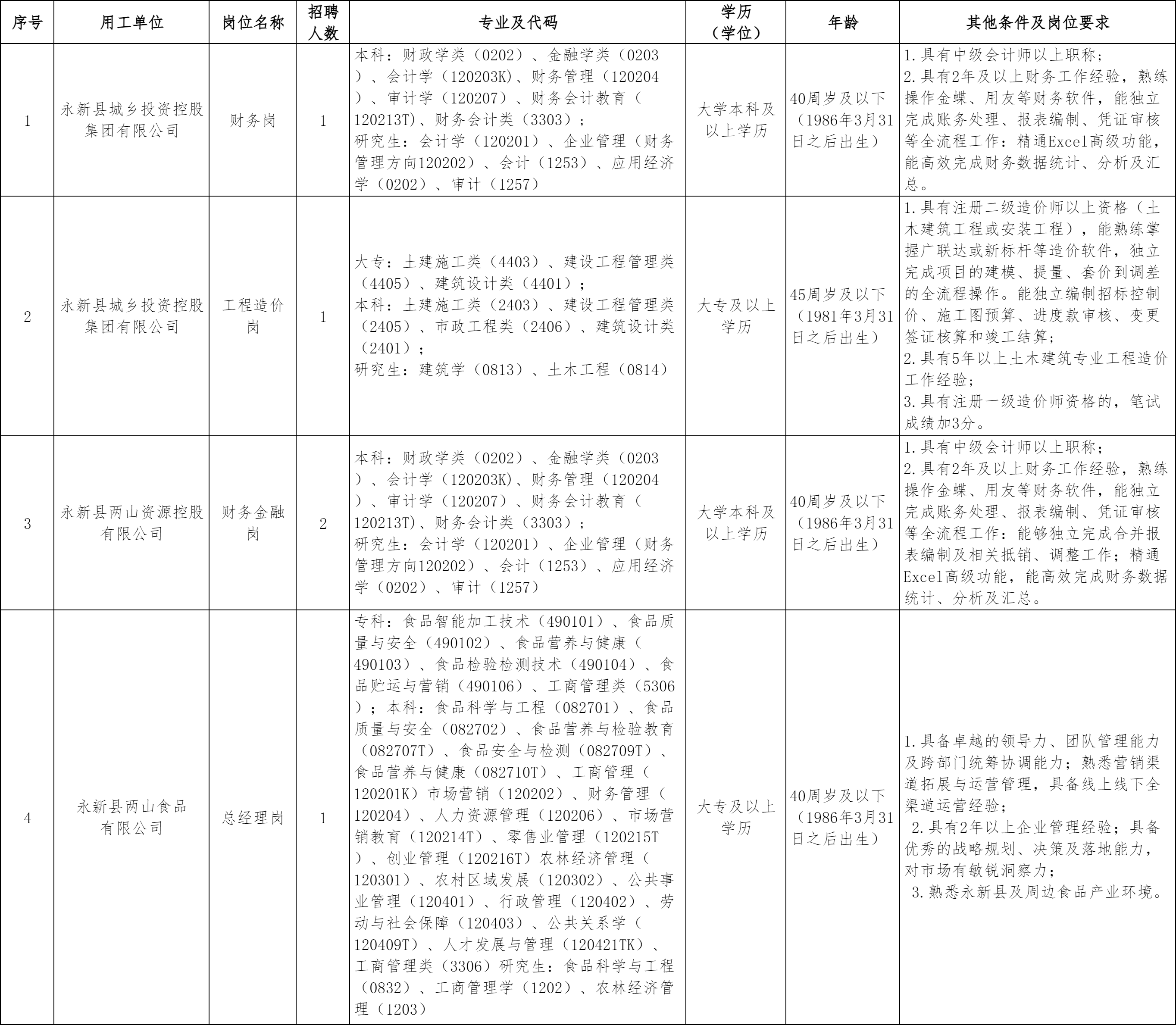 详见《永新县城乡投资控股集团有限公司招聘岗位及任职要求》(附件1),涉及专业及代码详见《学科专业目录汇编》(附件2)。