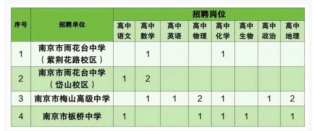 本次招聘相关信息在南京市人力资源和社会保障局网(http://rsj.nanjing.gov.cn)、南京市教育局网(http://edu.nanjing.gov.cn)等网站发布。具体的招聘单位、岗位、数量如下: