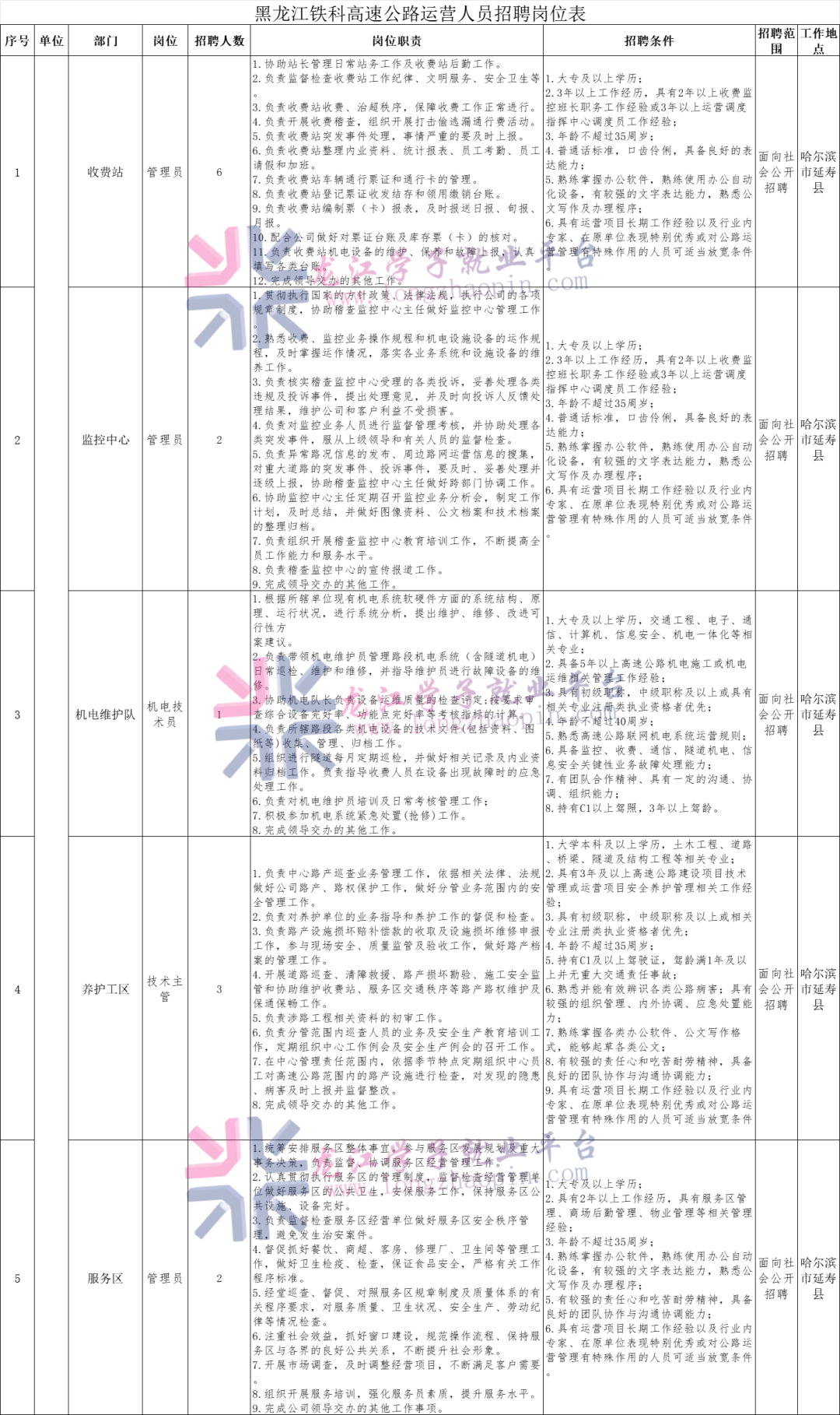 详见《黑龙江铁科高速公路运营人员招聘岗位表》(附件3)。