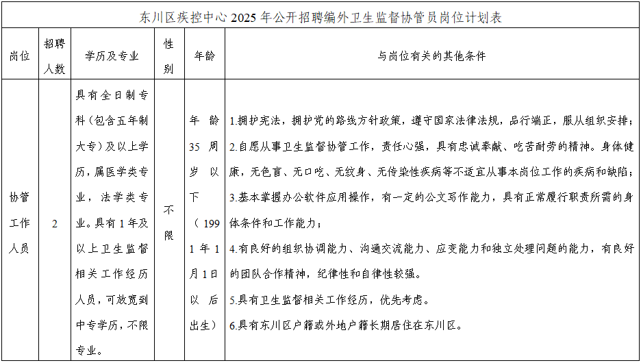 为适应新时期卫生健康监督工作需要,进一步加强我区卫生健康综合管理能力,根据《云南省卫生健康委关于进一步加强卫生监督协管服务工作的通知》(云卫监督发〔2020〕8号)及《关于进一步加强昆明市卫生监督协管服务工作的实施意见》(昆卫法规发〔2021〕6号)有关要求,结合我区卫生监督协管工作需要,东川区疾病预防控制中心面向社会公开招聘卫生监督协管员(辅助执法人员),现将有关事项公告如下: