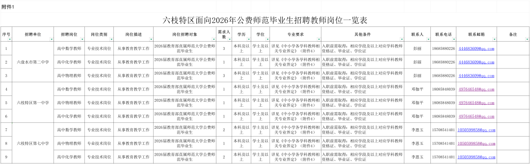 为促进六枝特区教育事业高质量发展,优化教师队伍结构,不断提高教育教学质量,切实做好六枝特区面向2026年公费师范毕业生公开招聘教师工作,根据《省教育厅办公室省人力资源社会保障厅办公室关于做好2026年公费师范毕业生和“优师计划”毕业生就业工作的通知》《事业单位公开招聘人员暂行规定》(人事部令第6号)和《贵州省事业单位公开招聘操作办法(试行)》等相关规定要求,结合六枝特区教育事业发展实际,现面向2026年公费师范毕业生公开招聘教师。