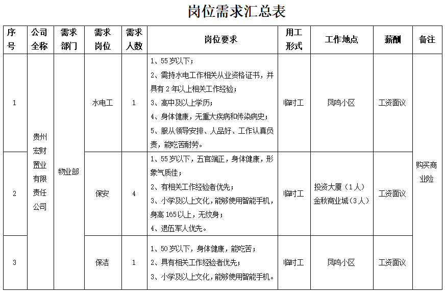 拟向社会招聘水电工1名、保安4名、保洁1名,共计6名。详见附件1岗位需求汇总表;