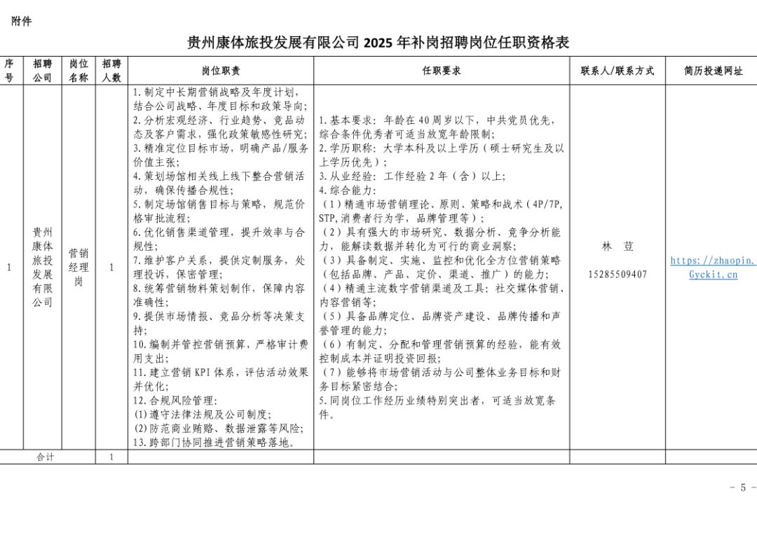 具体岗位职责和任职要求详见附件《贵州康体旅投发展有限公司2025年补岗招聘岗位任职资格表》,任职条件计算年龄、工作年限、任职年限或取得专业技术职称时间计算日截止于报名截止之日。