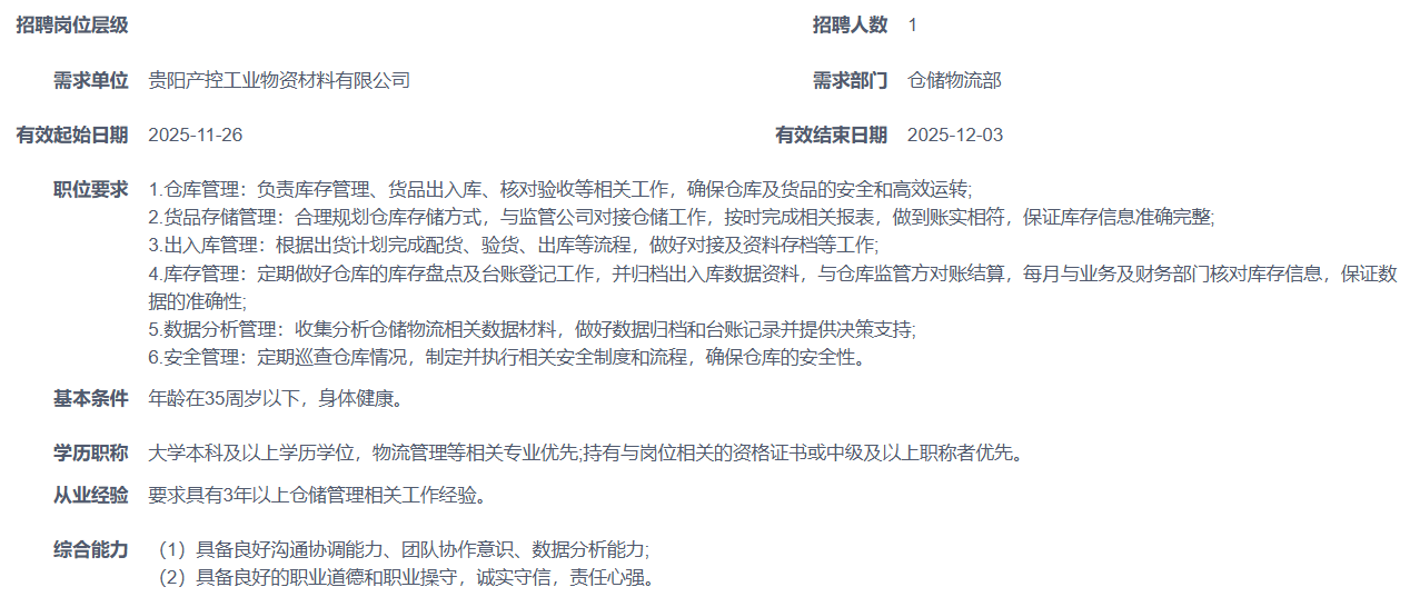 本次面向社会公开招聘工作人员1人,系仓储物流部仓储物流岗招聘1人。具体岗位要求详见附件《贵阳产控工业物资材料有限公司2025年(第二批)招聘职位表》。任职条件计算年龄、工作年限、任职年限或取得专业技术职称时间计算日截止于报名截止之日。