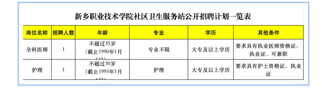 新乡职业技术学院社区卫生服务站根据业务发展需要,现委托新乡市人才集团有限公司面向社会公开招聘医学类相关工作人员若干名。