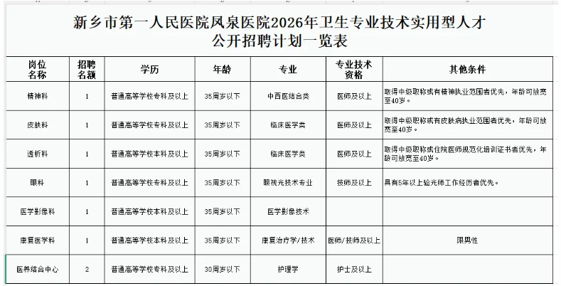 新乡市第一人民医院凤泉医院创建于1951年,目前为凤泉区唯一一所集医疗、预防保健、健康体检、科研教学为一体的二级综合性公立医院。医院总用地面积32亩,现有门诊楼、病房楼、中医康复楼各一座,总建筑面积17059平方米,目前在建二期综合楼项目总建筑面积17598平方米,规划建设12层,可提供床位300张,医院总床位500张。2023年6月16日,新乡市第一人民医院正式全面托管凤泉区人民医院,更名为新乡市第一人民医院凤泉医院,托管后双方实现全方位资源共享、技术共享、管理共享、品牌共享,新的管理团队重视科室建设,根据医院的总体战略定位,对科室进行合理规划和布局,明确各个科室的发展方向和重点,确保科室发展与医院整体发展相协调。为进一步加强基层医疗服务,结合当前公立医院改革实际,新乡市第一人民医院凤泉医院现面向社会公开招聘一批临床医学、医技、护理等各类卫生专业技术人员。