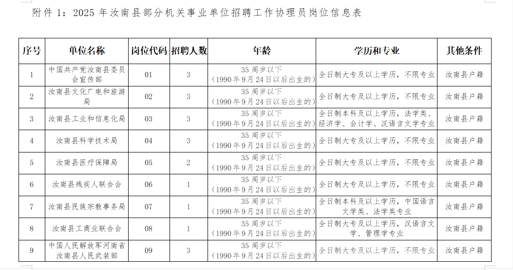 附件1:2025年汝南县部分机关事业单位招聘工作协理员岗位信息表