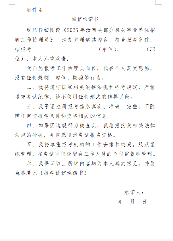 附件4:诚信承诺书