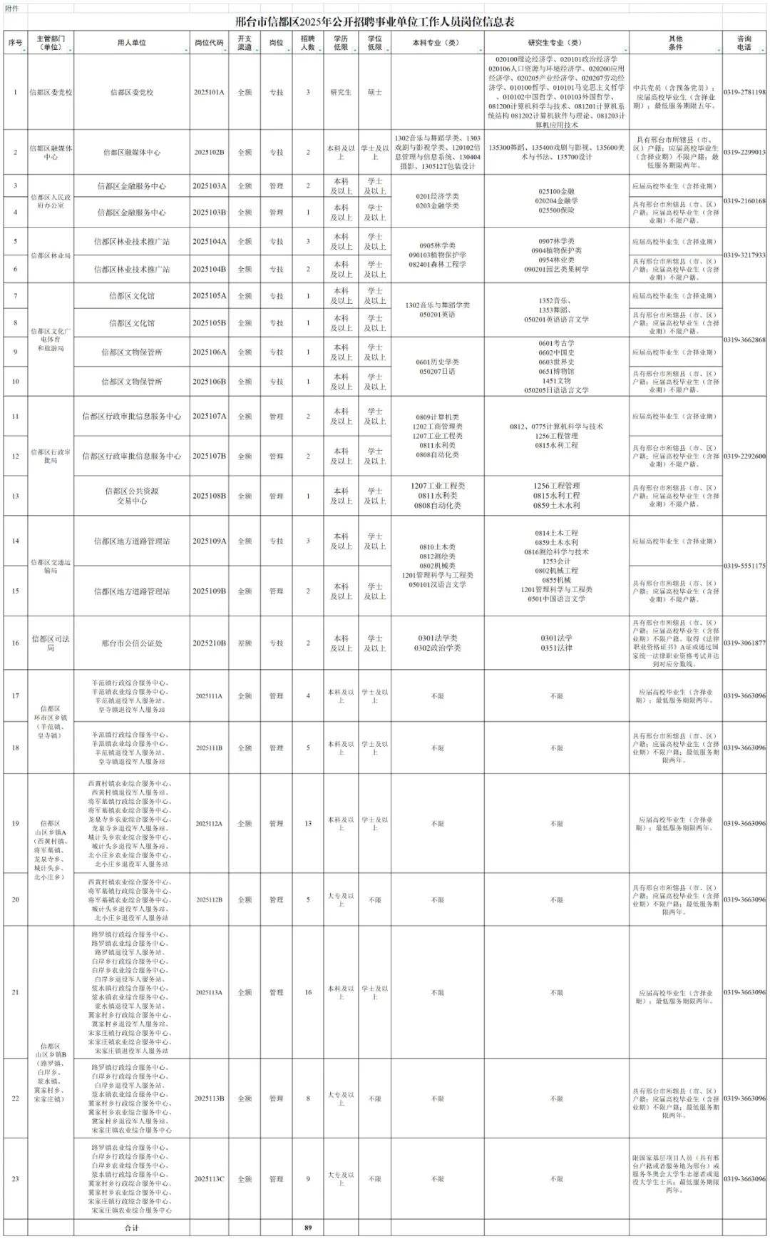 本次招聘事业单位工作人员共89名,各招聘单位招聘人数、具体岗位详见《邢台市信都区2025年公开招聘事业单位工作人员岗位信息表》(详见附件,以下简称《岗位信息表》)。