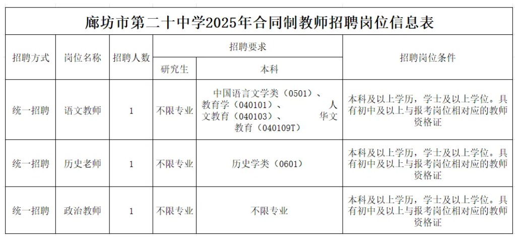 (五)具有岗位要求的相应学历、学位、专业、教师资格证。详见《廊坊市第二十中学2025年合同制教师招聘岗位信息表》。