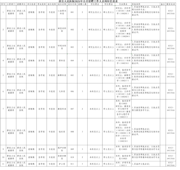 招聘岗位名额及所需具体条件等详见《唐县人民医院2025年公开招聘工作人员岗位信息表》。