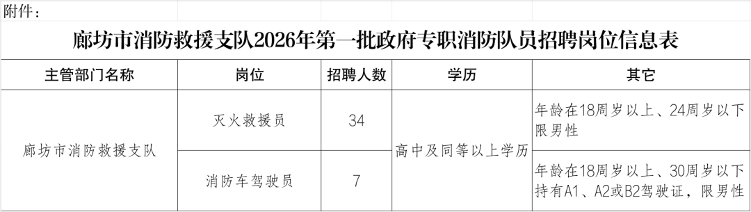 附件:廊坊市消防救援支队2026年第一批政府专职消防队员招聘岗位信息表