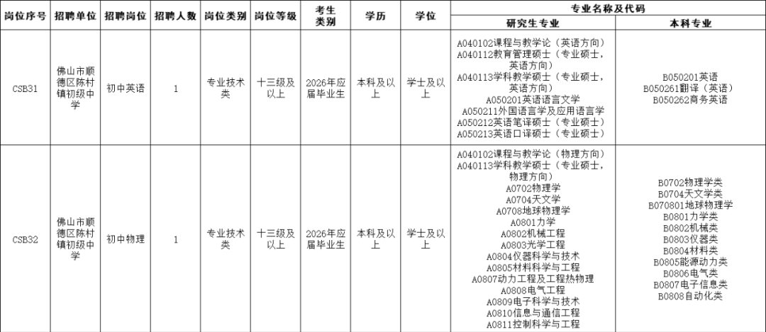 详见《“百万英才汇南粤”佛山市顺德区教育局面向2026届毕业生赴高校设点公开招聘教师(第一批)公告》,一切以该公告为准(可点击以下链接打开):http://zzb.shunde.gov.cn/data/main.php?id=576686-110485