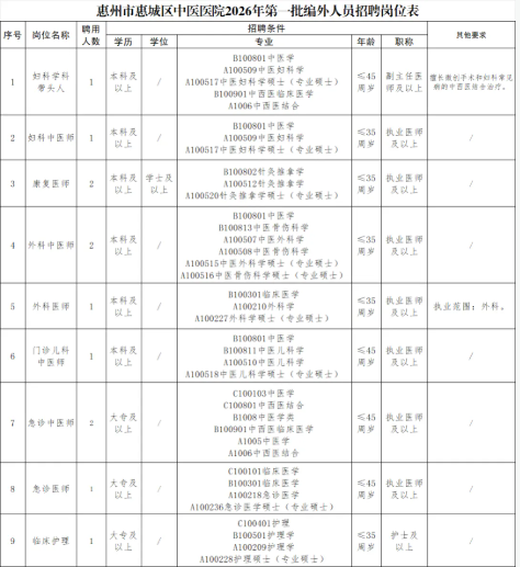 现根据工作需要,按公开、平等、竞争、择优的原则,惠州市惠城区中医医院决定面向社会公开招聘一批工作人员,现将有关事项公告如下: