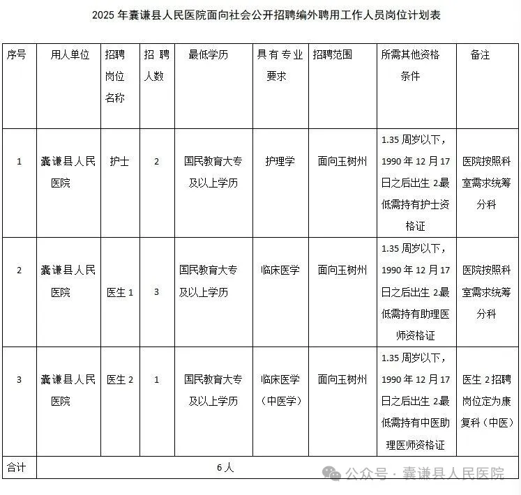 为加强我院医疗人才队伍建设为核心,拓宽选人用人渠道来优化人才结构,同时兼顾解决社会就业问题,进一步补充我院医疗、护理专业技术力量,优化人员队伍结构,推进医院高质量发展,最终更好地满足囊谦县当地群众的医疗卫生服务需求为目的,依据《事业单位人事管理条例》《医疗机构人员招聘相关规定》,结合我院诊疗工作实际及发展需要,现面向社会公开招聘编制外专业技术人员6人,现将有关事项公告如下: