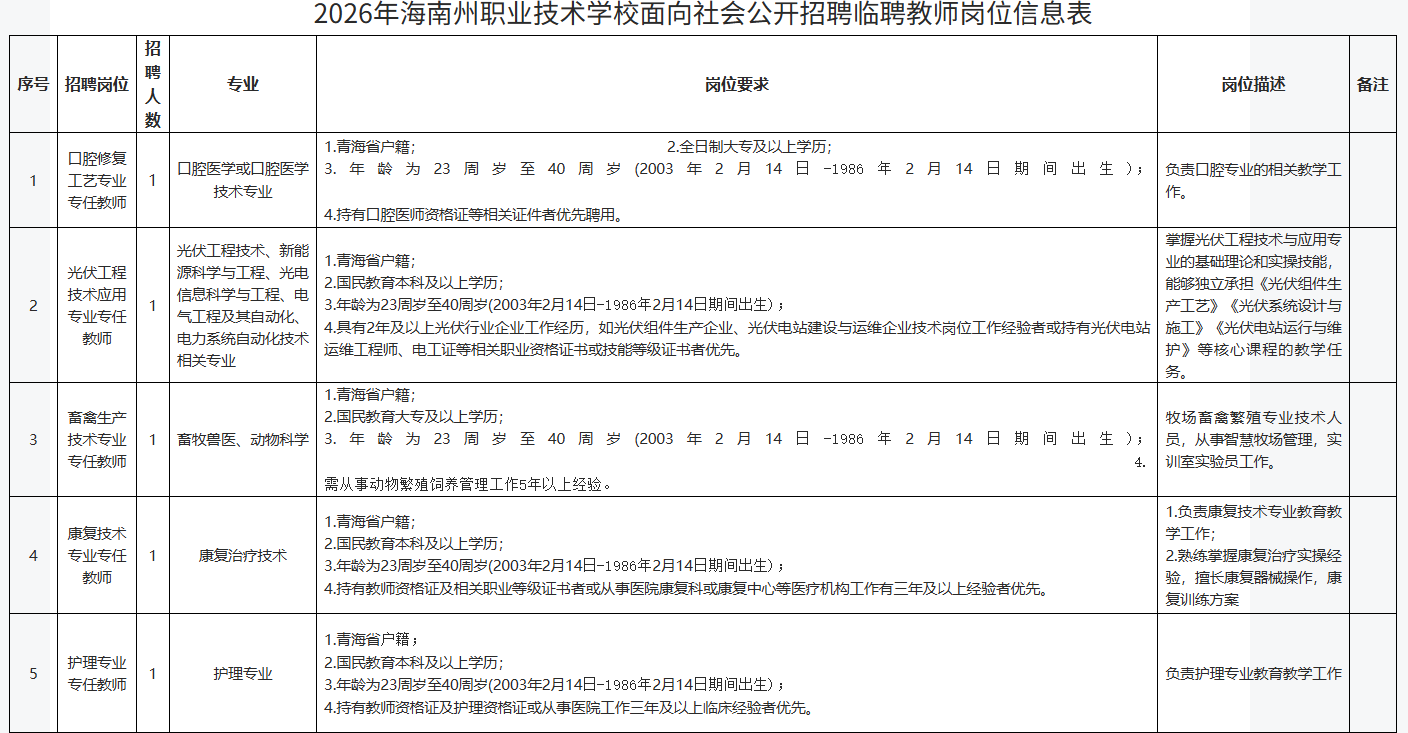 详见附件《2026年海南州职业技术学校面向社会公开招聘临聘教师岗位信息表》