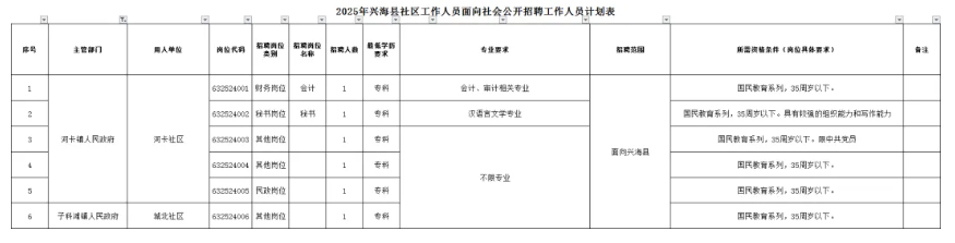 招聘社区工作者共计6名,其中城北社区1名、河卡社区5名。
