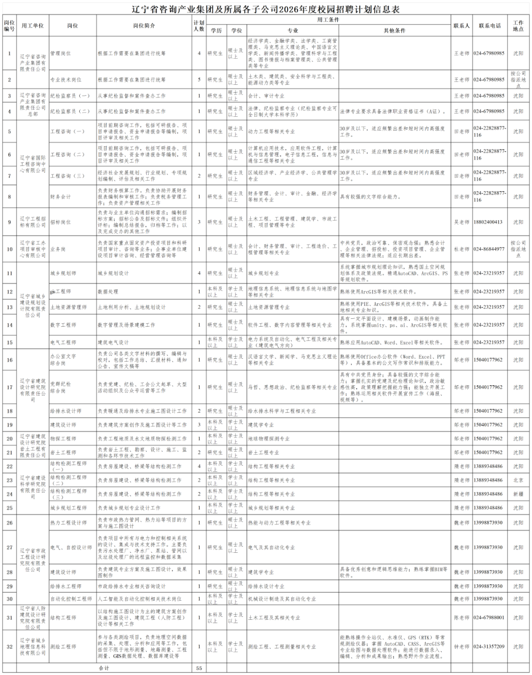 5.招聘联系方式:具体岗位咨询电话详见《辽宁省咨询产业集团及所属各子公司2026年度校园招聘计划信息表》联系人、联系电话(周一至周五上午8:30-11:30,下午1:30-4:30)。