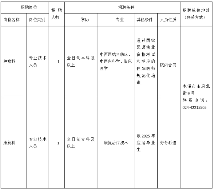 本溪市中医院2025年公开招聘编外专业技术人员岗位表