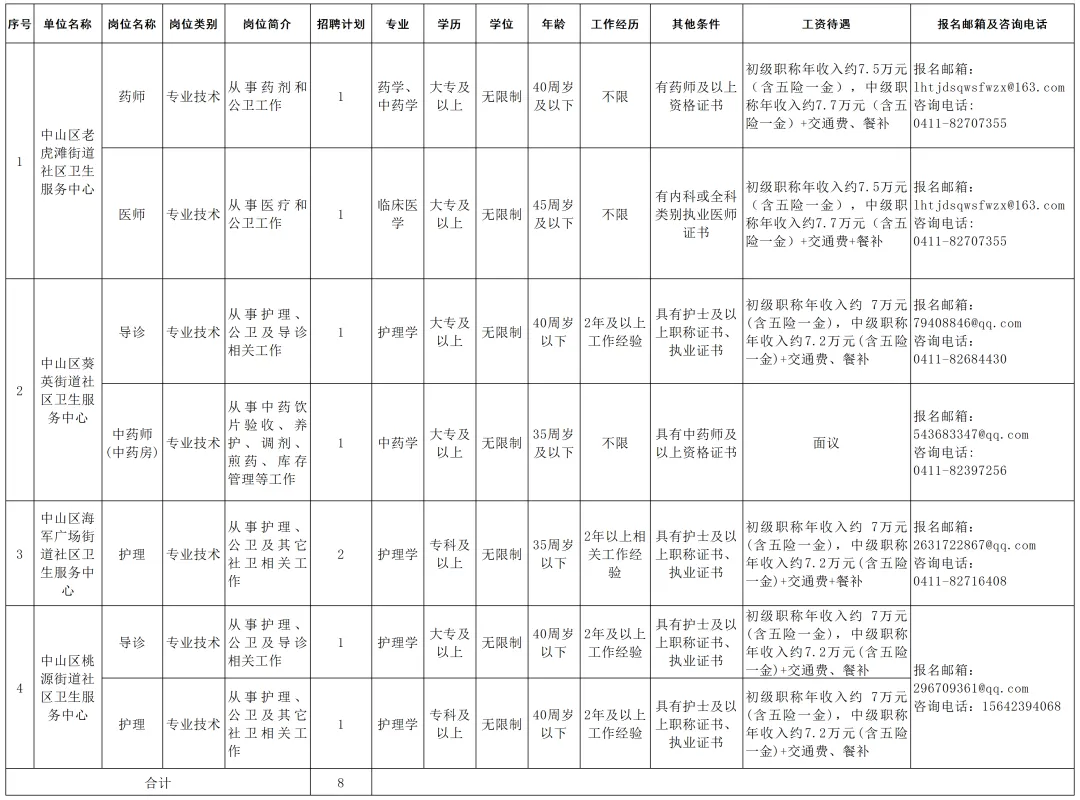 为提升中山区医疗集团医疗卫生服务能力,加大我区医疗卫生服务力度,中山区医疗集团拟面向社会公开招聘非事业编制工作人员8名,补充到中山区公办社区卫生服务中心。现将有关事宜公告如下。