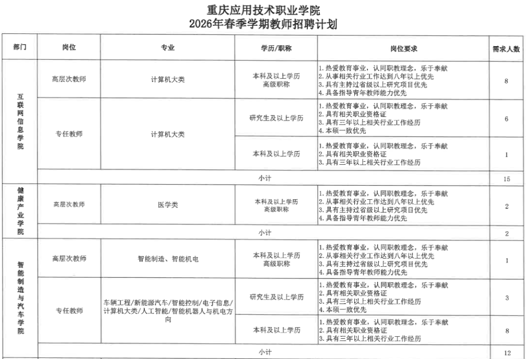 重庆应用技术职业学院2026年春季学期教师招聘计划
