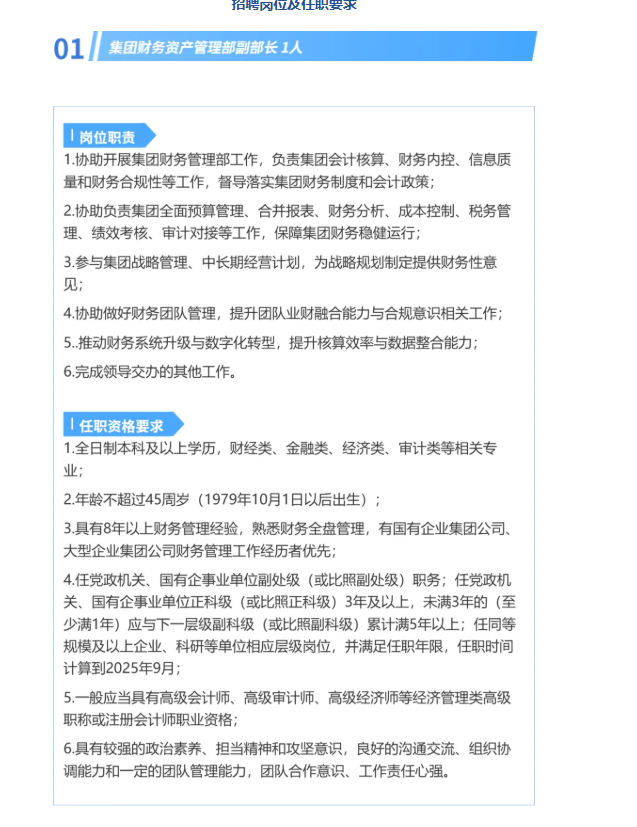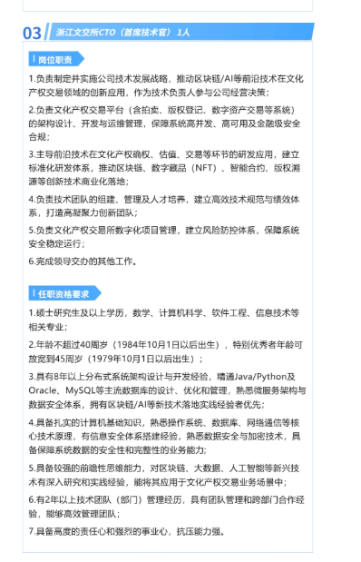 因发展需要特向社会公开招聘集团财务资产管理部副部长1人、集团下属二级企业副职领导2人、浙江文交所CTO(首席技术官)1人。