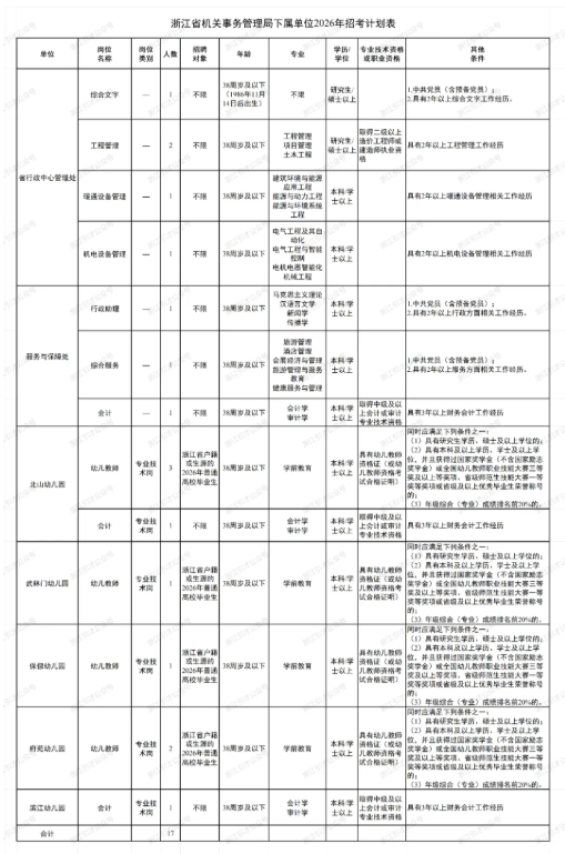 根据有关规定,浙江省机关事务管理局决定组织后勤服务编制单位和直属幼儿园面向社会公开招录(聘)工作人员。现将有关事项公告如下: