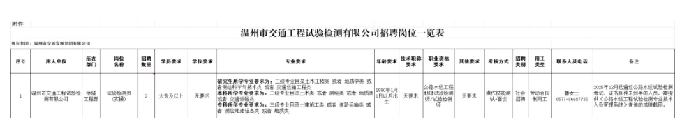 具体岗位及相关要求,详见《温州市交通工程试验检测有限公司招聘岗位一览表》(以下简称“附件”)