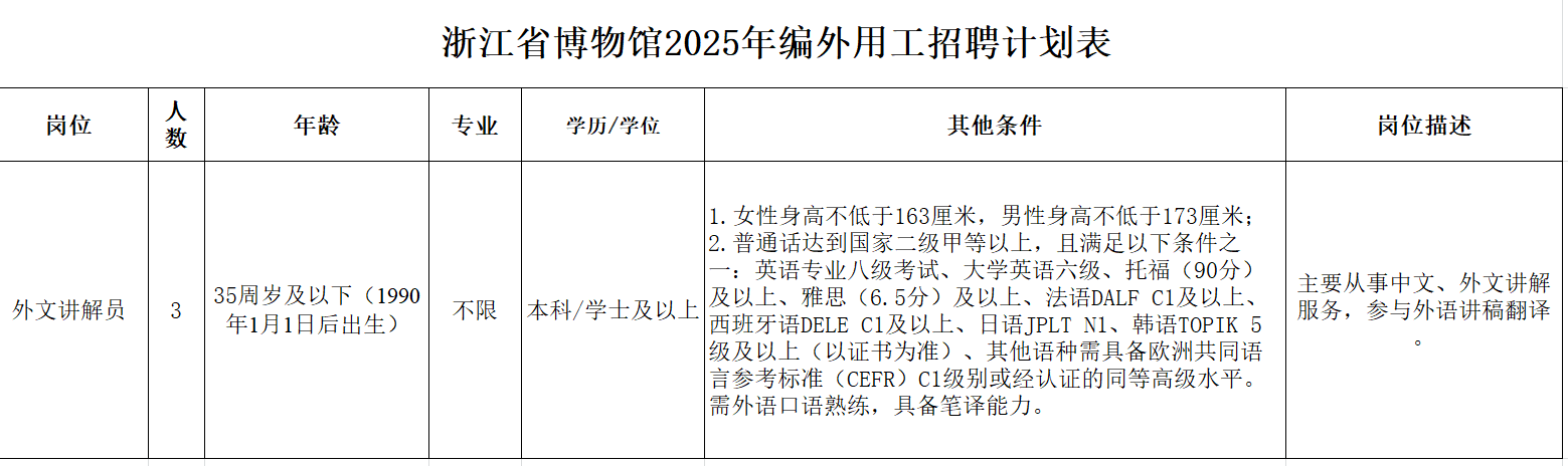 浙江省博物馆为补充编外用工的需要,经研究,决定面向社会公开招聘编外工作人员。现将有关事项公告如下: