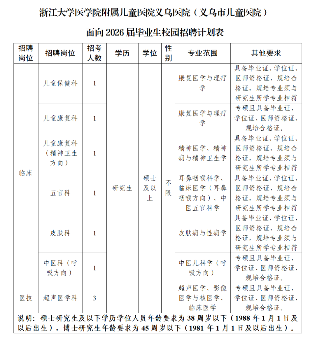 5.其他条件和要求详见《浙江大学医学院附属儿童医院义乌医院(义乌市儿童医院)面向2026届毕业生校园招聘计划表》。