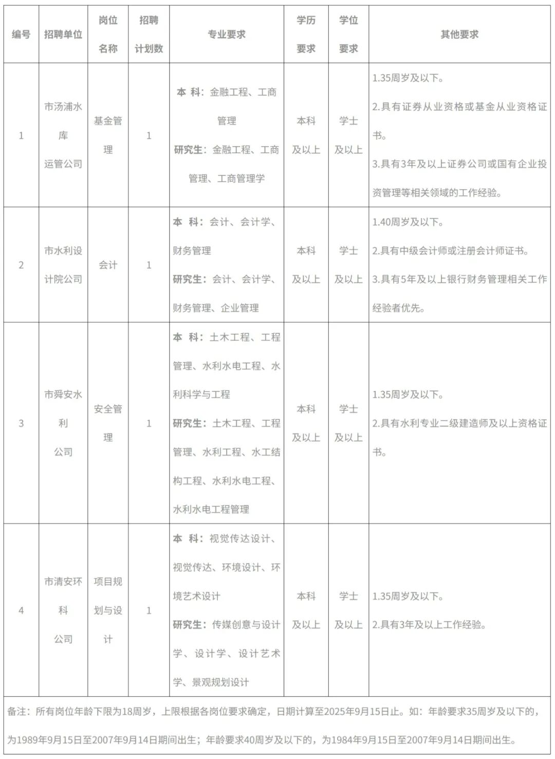 本次招聘总计4人,其中:市汤浦水库运管公司1人,市水利设计院公司1人,市舜安水利公司1人,市清安环科公司1人。