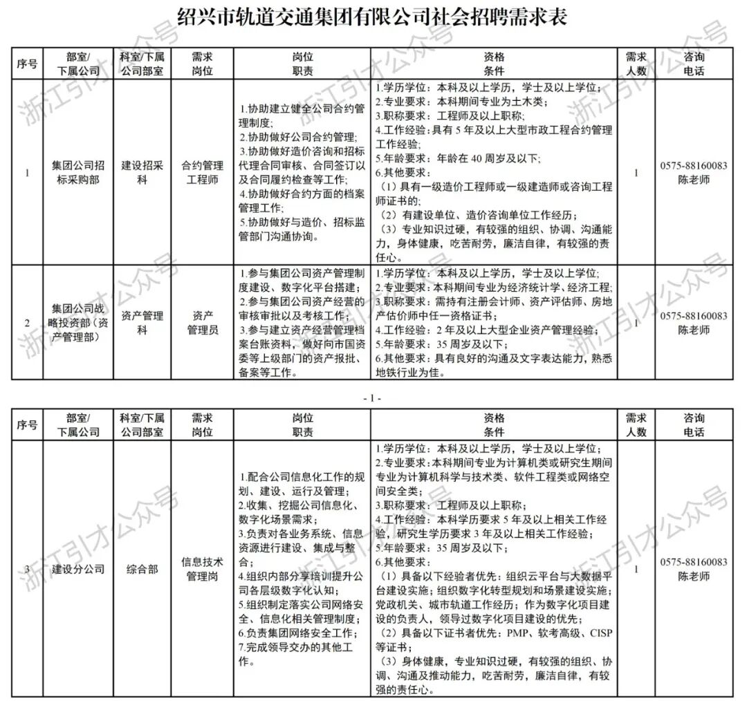 (二)具体招聘岗位及资格条件:详见《绍兴市轨道交通集团有限公司社会招聘需求表》(附件1)。