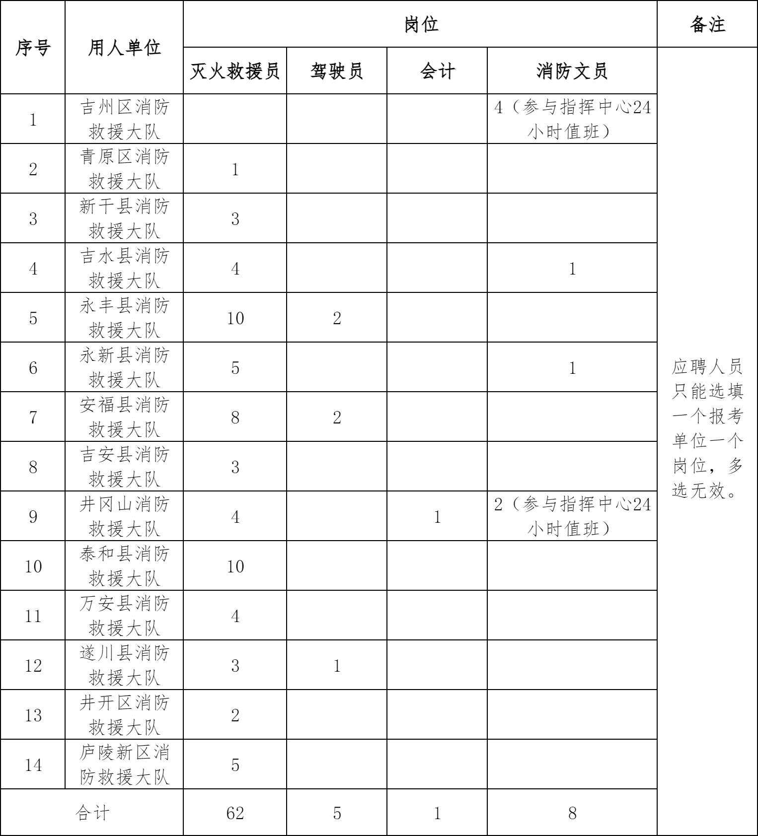 共招聘76名政府专职消防员(其中,灭火救援员、驾驶员岗位限男性,若驾驶员岗位未招满,缺额视情纳入该单位灭火救援员岗位招聘计划)。具体用人单位和招聘数量见下表。